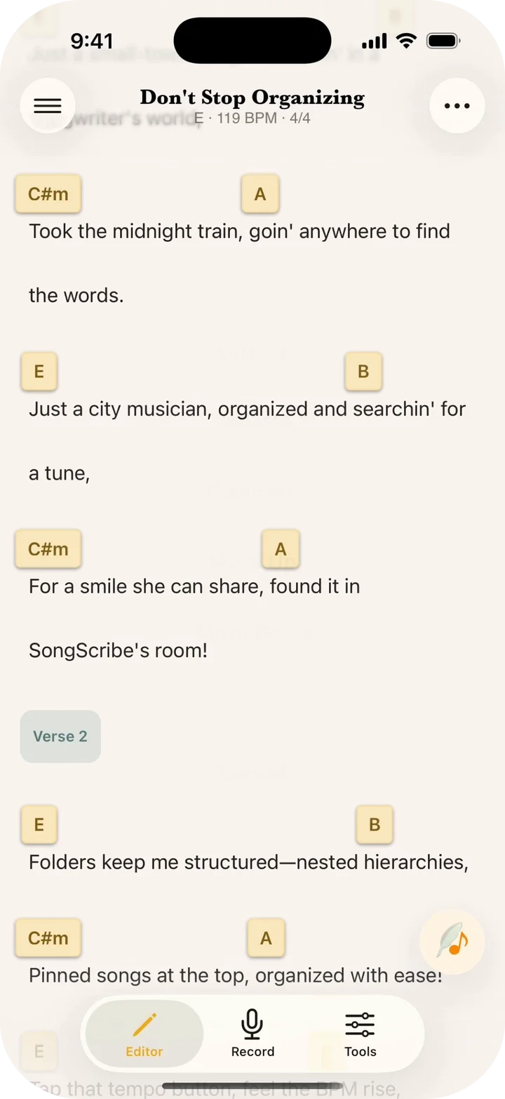 Tap a word. Drop a chord. Keep writing. Your lyrics and chords stay where you put them, exactly as they need to be.